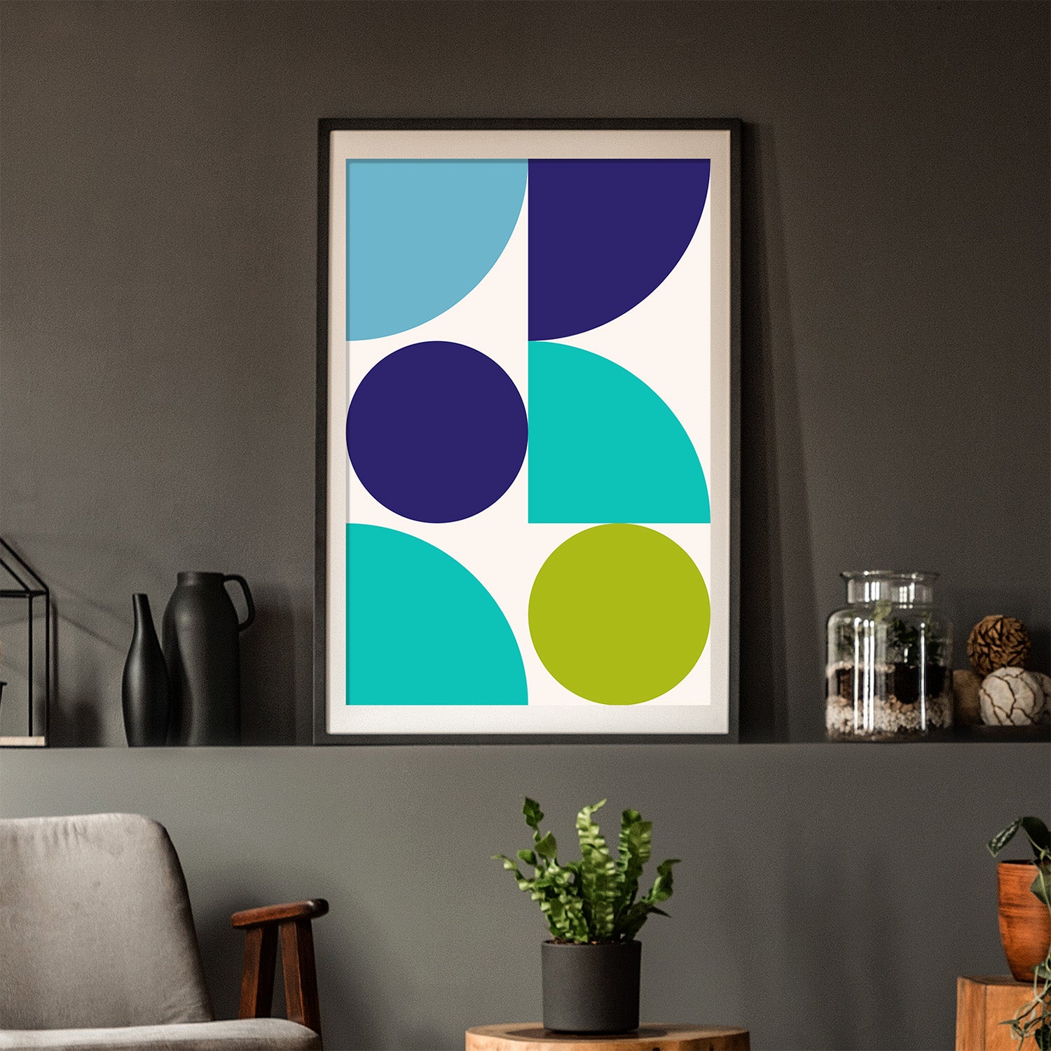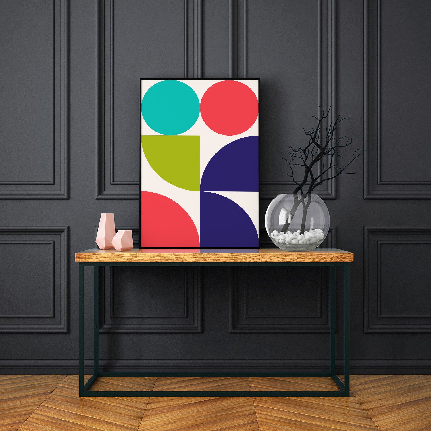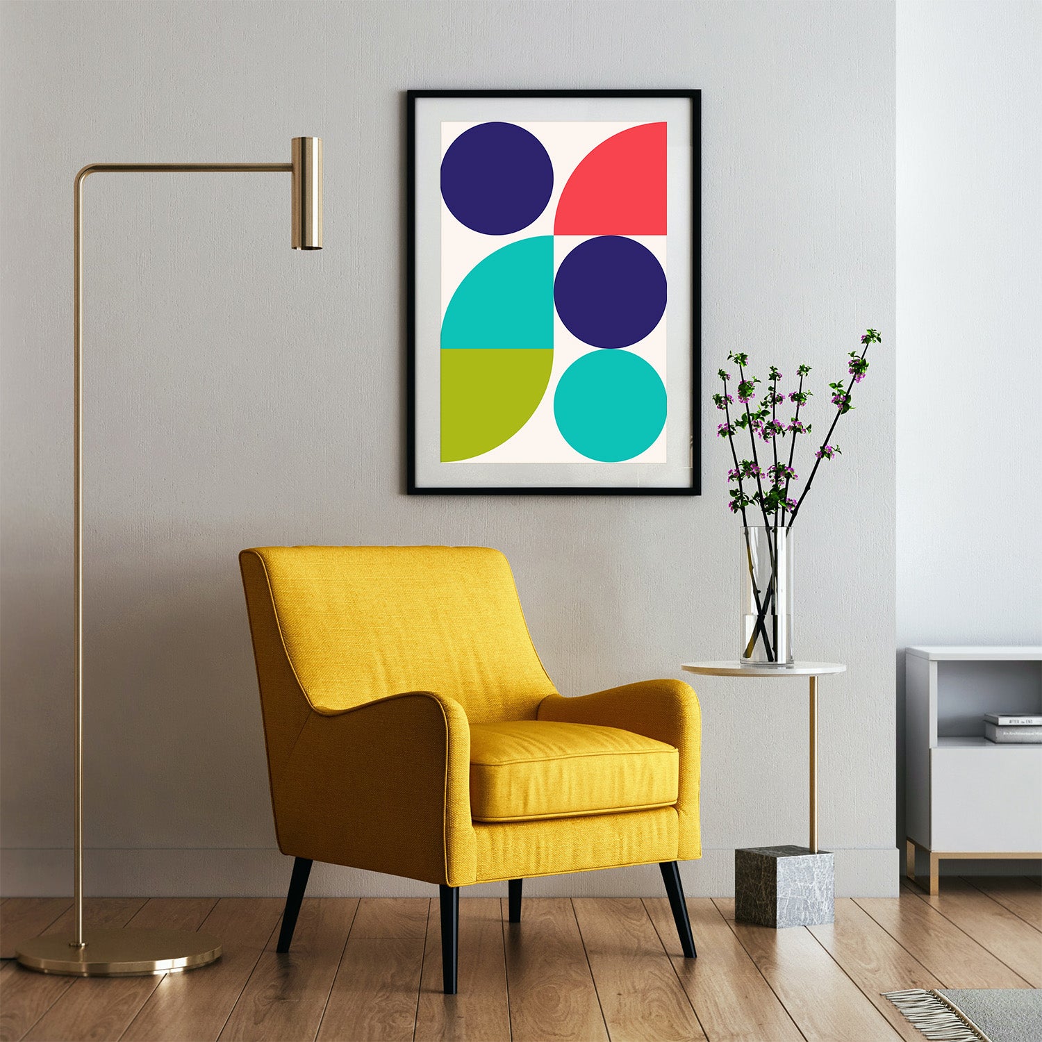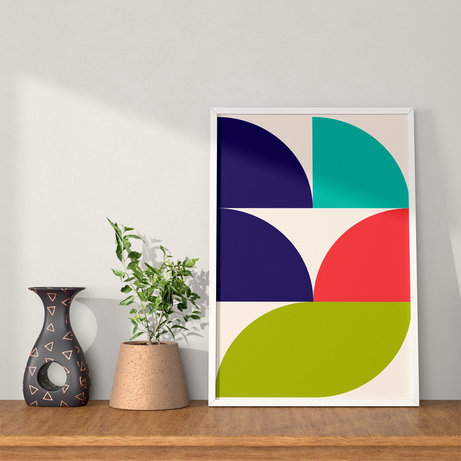 Graphical illustration inspired by the Bauhaus art movement, where architectural, austere, and geometric shapes are the basis. A vibrant choice of colors creates a beautiful depth that will give a room or a place in your home more life and color. Graphic art is an excellent choice if you want a more colorful home.